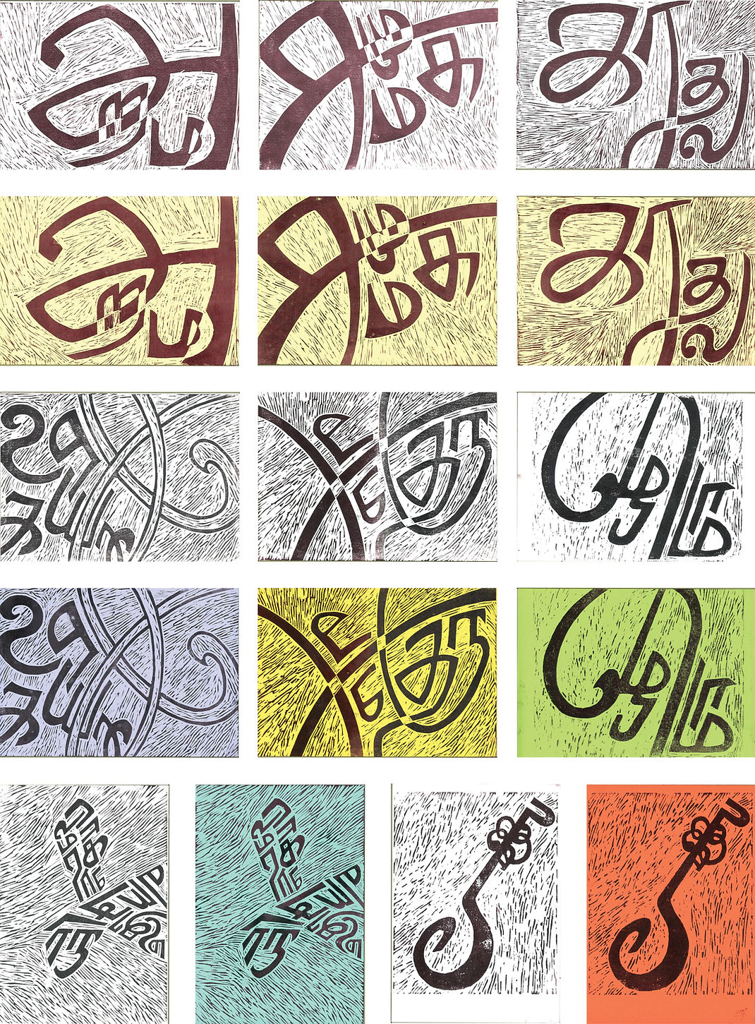 This project aims to bring a new perspective to classical Tamil texts from the Sangam era by crafting visually engaging, contemporary designs using lino printing inspired by Tamil script. By blending traditional Tamil typography with contemporary designs, the project intends to make these ancient texts, each rich with timeless wisdom, accessible and appealing to a modern audience. The texts selected, including Tirukural, Tholkappiyam, and Seevaga Chinthamani, are pivotal works that reveal the depth of Tamil language and literature, parallel to the development of Sanskrit.